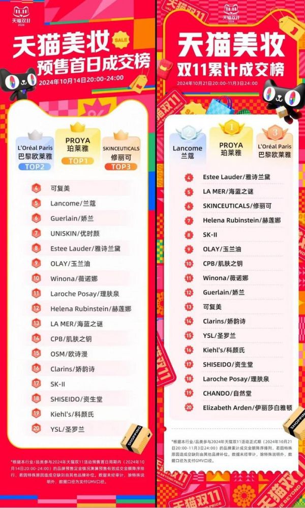 根据“天猫大美妆”公布的“预售首日成交榜”,天猫双11活动预售首日周期内成交额TOP20中,珀莱雅居首,国产品牌可复美、优时颜、薇诺娜、欧诗漫分别位列第4、第7、第10和第15名。海外品牌方面,欧莱雅集团旗下的巴黎欧莱雅、修丽可、兰蔻、理肤泉、赫莲娜、科颜氏、圣罗兰纷纷上榜,共占7个席位,比去年还要新增2个。