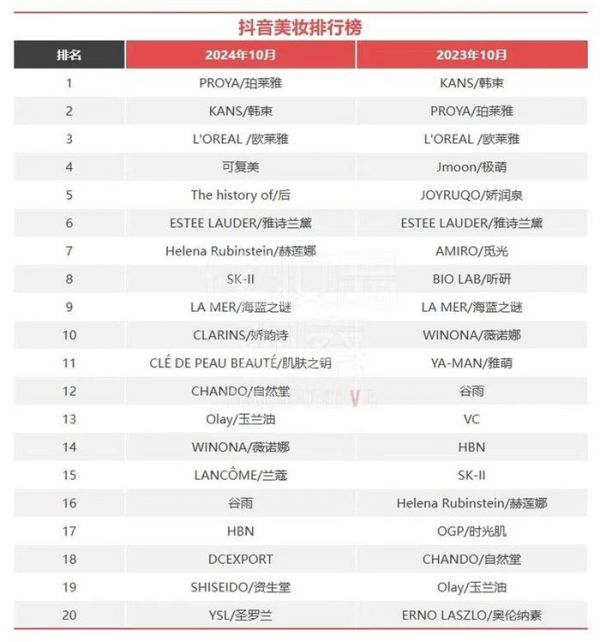 对比去年同期数据,2023年10月抖音美妆排行榜TOP20里,外资品牌上榜数量只有7个,到了今年10月,上榜数量增加到了13个。这也说明了外资品牌也开始注重在兴趣电商平台的投入,适度调整营销策略,注重发力直播带货和内容营销,并且取得了不错的成效。