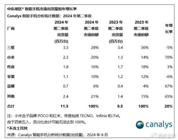 Canalys:Q2中东智能手机市场份额三星、传音、小米分列前三