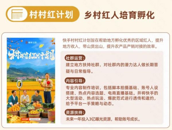未来一年,快手将在村村红计划中投入3亿曝光资源,帮助账号成长,还将从社群运营和内容指导等方面孵化区域红人,提升地方收入,带山货出山,提升农产品产销对接效率。