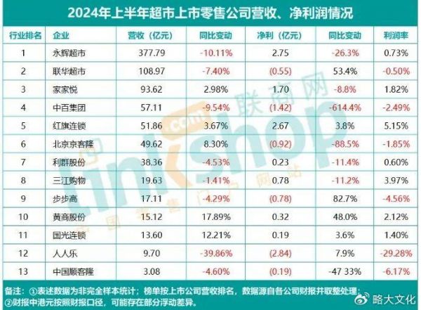 联商网曾统计过一组数据:2023年度,14家超市上市公司中,有七成出现营收下降,一半的商超出现亏损状况。这种颓势延续到了今年。2024年上半年,联商网统计的13家上市传统商超中,仍有8家超市的营收在上半年出现下降,其中人人乐、永辉更是跌幅超过10%。