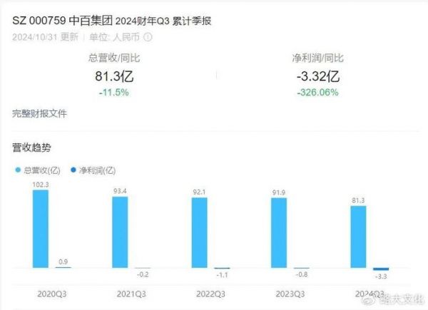 今年前三季度,中百集团实现营收81.3亿元,同比下降了11.50%,归属于上市公司股东的净利润亏损3.32亿元。