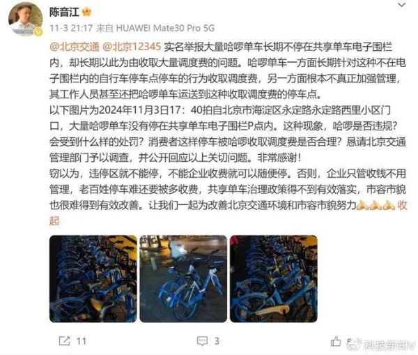 陈音江还附上了近期北京某地大量哈啰单车没有停在共享单车电子围栏P点内的相关图片作为证据。该博文下,北京12345回应称,其反映的问题我们会核实交办。