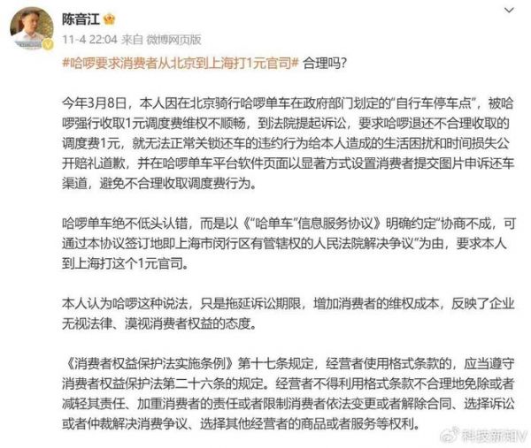 因哈啰收取1元调度费问题,陈音江将其告上了法庭,索赔1元。值得注意的是,哈啰向全国各地的消费者提供服务,用户协议中却要求发生争议只能到上海闵行区相关法院诉讼。陈音江认为,这明显排除和限制了消费者权利,减轻了自身的责任,这属于霸王条款。