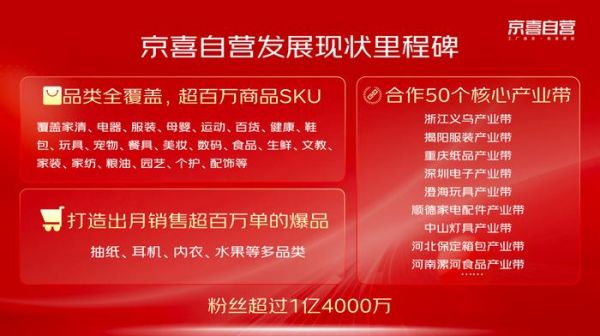 京喜自营自2023年底上线以来,商品种类全覆盖,商品SKU超过1百万,月销超百万单的商品层出不穷,每月18日举办的买一送一活动有效增加了客户粘性,目前京喜自营官方店粉丝超过1亿4千万人。