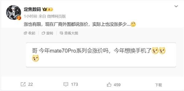 快科技11月9日消息,博主定焦数码暗示,华为Mate 70系列要涨价,不过涨价幅度不会很大,现在厂商都说要涨价,但实际上并没有涨多少。