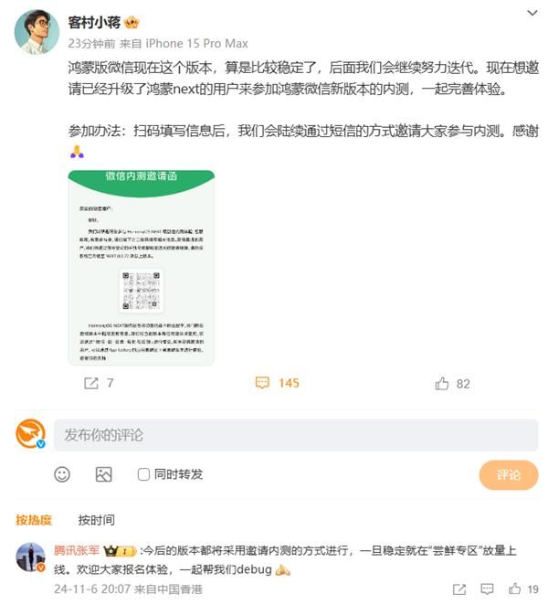11月6日晚间,腾讯WXG(微信事业群)员工客村小蒋在其微博上发布了一条消息,宣布微信原生鸿蒙版采用内测邀请制度。这一消息在科技界引起了广泛关注,因为它意味着微信在鸿蒙操作系统上的布局迈出了重要一步。