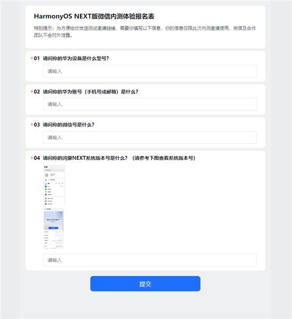 获得内测邀请的用户将通过登记的手机号或邮箱收到测试邀请链接。为了确保测试的准确性和有效性,用户需要确保其设备系统已升级至鸿蒙NEXT.0.0.72及以上版本。在报名表中,用户需要填写包括华为设备型号、华为账号、微信号以及鸿蒙NEXT系统版本号等信息,以便团队更好地管理和跟踪测试进度。