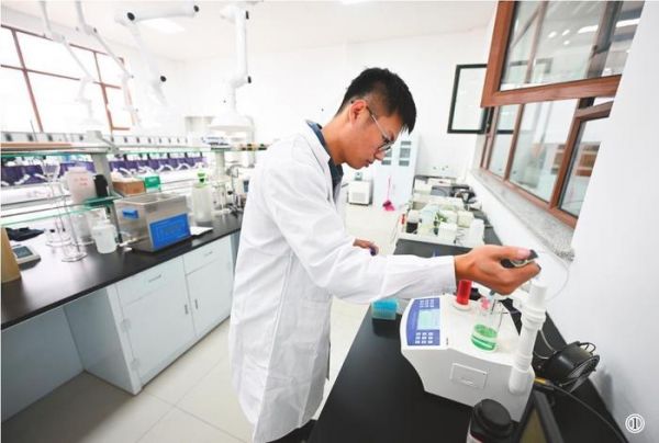 图②为公司工作人员展示钒电池电解液电原材料。
