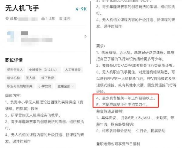 而成都另一个薪资4000~9000元之间的无人机飞手岗,也要求最少一年工作经验以上,并表示不招应届毕业生不招实习生。