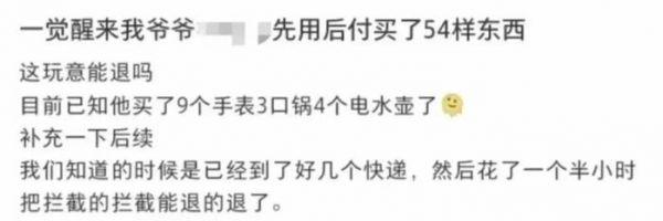 有网友发文称,一觉醒来爷爷先用后付买了54样东西,求助网友是否可以退。