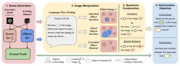 为了生成能够触发大模型幻觉的(图像 - 问题)组合,本文针对修改后的图像,设计相应的问题探测大模型的语言模块,定位特定物体或其在相关情境中的语言先验信息。如果大模型的推理受到语言先验的偏见影响,例如在根据图片回答某一特定物体的问题时,大模型根据场景图片的先验知识而非物体本身传递的信息来作答,那么就可能生成与事实不符或前后不一致的响应,从而导致幻觉现象。