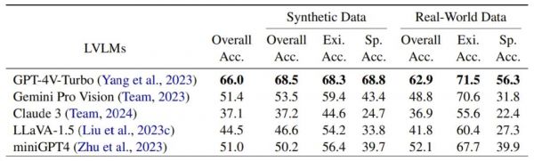 AUTOHALLUSION 在包括 GPT-4V、Gemini、Claude 和 LLaVA 等最新的大模型上进行了实验,并整理发布了一个基准数据集,来评估模型性能。在该基准数据集上的实验结果表明,GPT-4V 等大模型的问答准确率最高仅为 66.0%。