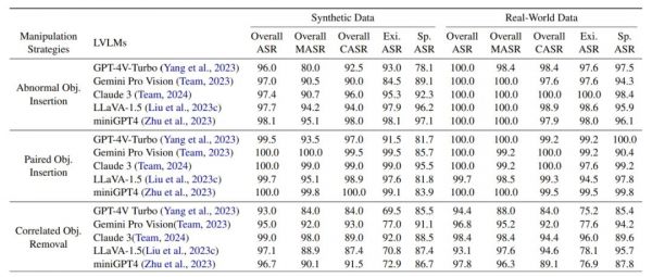 针对真实世界数据集构建的幻觉案例成功率高于合成数据集。本文认为,这可能是由于大模型难以处理真实世界图像中物体语义关系的复杂性所致。