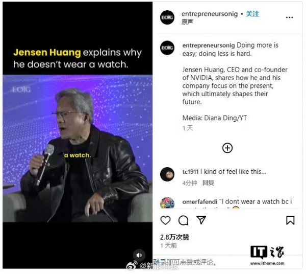 【#黄仁勋回应不戴手表#】英伟达 CEO 黄仁勋在近日的一次科技活动上分享了他的独特时间观,并解释了为什么他不戴手表。这位科技巨头的领导者强调了活在当下的重要性。