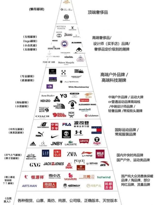 现在你买不起上三层的品牌,不要紧,这个月攒五百,下个月攒一千,明年冬天你也能身穿大鹅,站在鄙视链上层俯瞰别人。