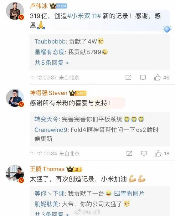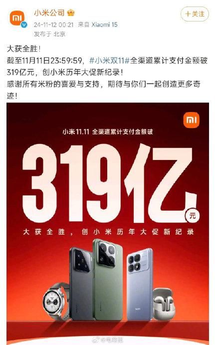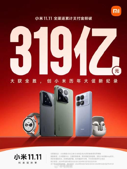全渠道累计支付金额破319亿 ,小米双11创造新纪录!