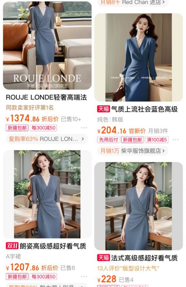 “模特长得一样、姿势一样,连衣服的褶皱都一样。”北京市民娄女士看着某女装商品页面说道。该店铺6套连衣裙的模特图片均十分相似,图中模特躺在沙发上,6套衣服的模特图人物动作和背景完全一致,甚至光影位置都一模一样,变化的只有身上的衣服。
