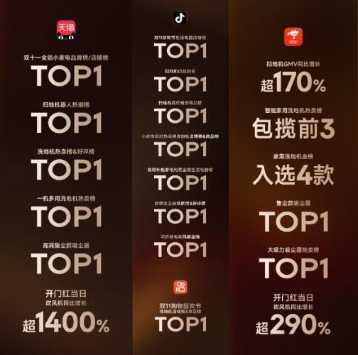 同时,追觅在京东、天猫、抖音、快手等核心电商渠道还拿下多个品牌榜单TOP1的好成绩,其中包括天猫双十一全站小家电品牌榜/店铺榜TOP1、抖音双11好物节生活电器店铺榜TOP1、抖音政府补贴家电热卖金榜生活电器榜TOP1等。