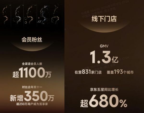 电商平台如火如荼,线下市场也多点开花。本次大促,追觅科技线下在营831家门店,覆盖193个城市,总GMV突破1.3亿,在京东五星销额同比增长超680%,再创新高。同时,全渠道品牌会员人数超1100万人,同比去年双11新增350万人。