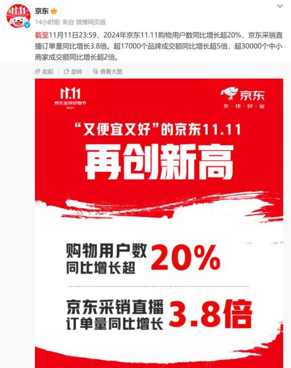 (图源:微博截图)在国内众多电商平台中,京东对待双11的态度可能是最积极的,在此期间还推出了“先人一步”计划。该计划充分利用了京东的仓储和物流优势,能够在极端时间内为用户配送购买的电子产品,一些刚发售的新机,消费者甚至可能在评测博主的文章、视频发布之前,就拿到了产品。