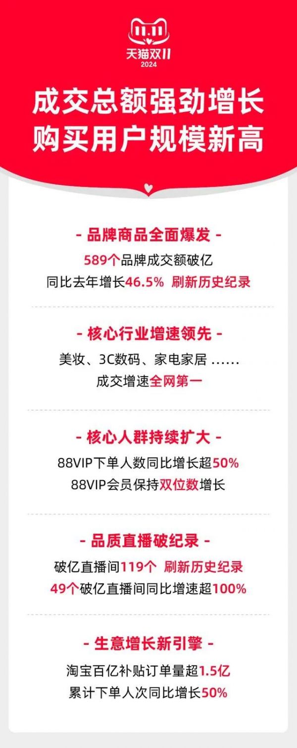 天猫官方数据显示,截至11月11日,天猫平台成交额增长强劲,共有589个品牌成交过亿,同比增长46.5%,刷新了历史纪录。美妆、3C数码、家电家居等品类,天猫拿下了成交额增速全网第一,淘宝百亿补贴订单量超过1.5亿,累计下单人次同比增长50%。