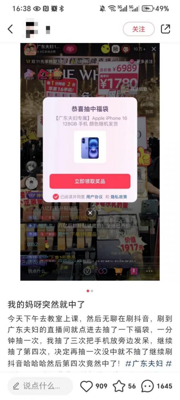 “我的妈呀突然就中了,今天下午去教室上课,无聊刷抖音,刷到直播间就随意抽了福袋竟然中了!!简直是锦鲤附体”,本是日常的好运分享却又掀起了一场新的直播间抢购风暴。