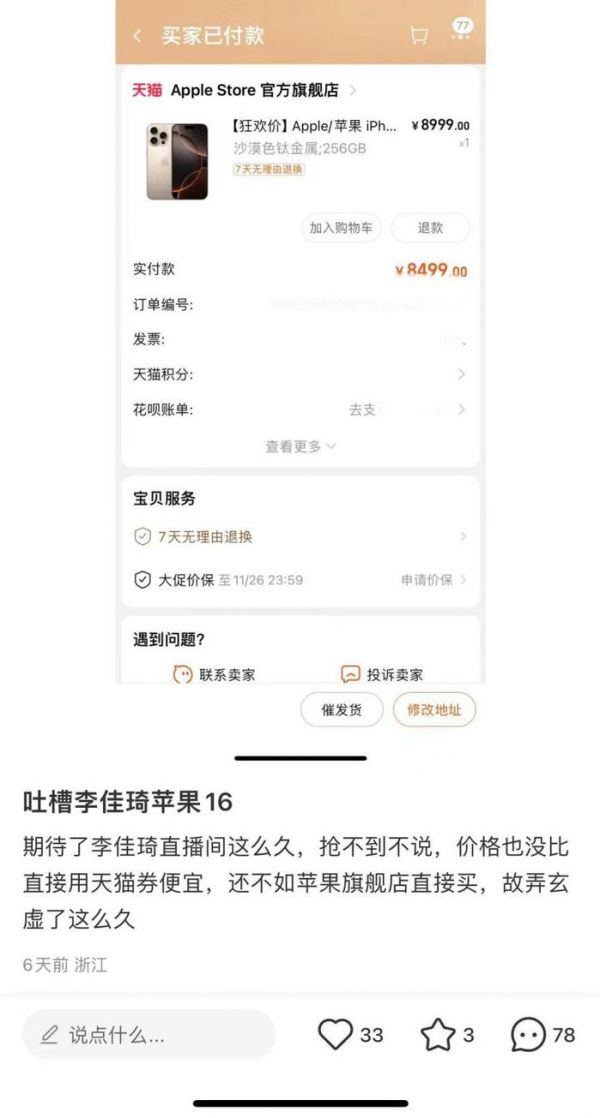 比如美ONE,即便有“所有女生”“所有女生的衣橱”等垂类直播间,并且对直播时段和带货品类都有新的尝试,更是减少了李佳琦本人的出镜时长与直播频率,而消费者对李佳琦直播间的滤镜也渐渐在碎掉——今年双十一,有网友在小红书吐槽,李佳琦直播间的苹果16不仅难抢,价格还不如用券之后在官方旗舰店直接买。