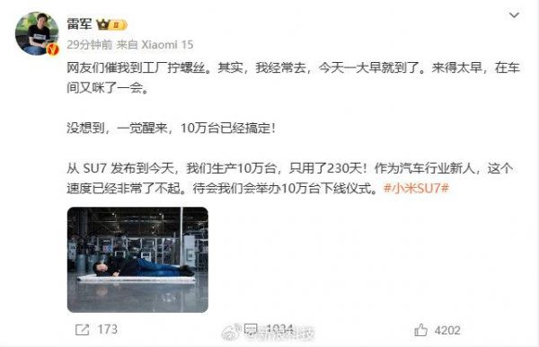 小米SU7已生产10万台,雷军晒照:雷军在车间打地铺