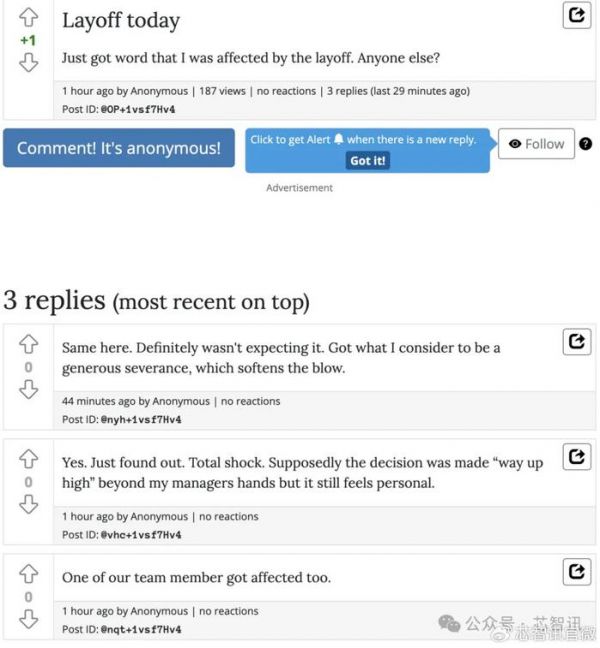 留言板上的另一篇帖子“The Layoff”也提到了裁员。在回应原发帖人“受到裁员影响”的声明时,四名匿名用户表示,他们或他们认识的人受到了影响。一名用户评论说,虽然他们没想到会被解雇,但他们得到了“一笔丰厚的遣散费,减轻了打击”。