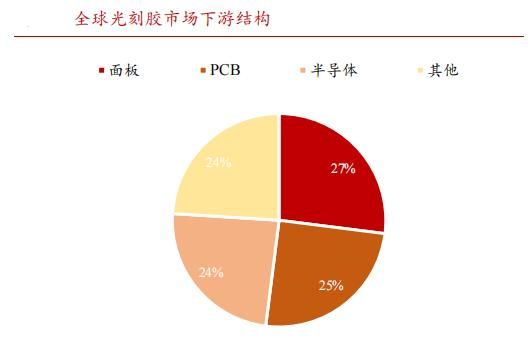 从光刻胶下游市场结构看,显示面板光刻胶占比最高为27%,超过了半导体光刻胶和PCB光刻胶。