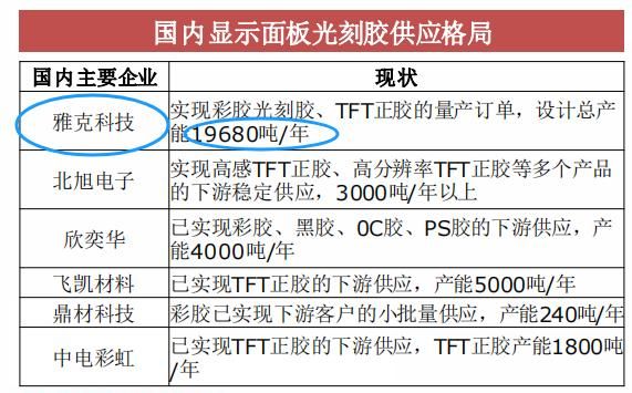 现阶段,我国的显示面板光刻胶厂商,主要包括雅克科技、北旭电子、飞凯材料、中电彩虹等。