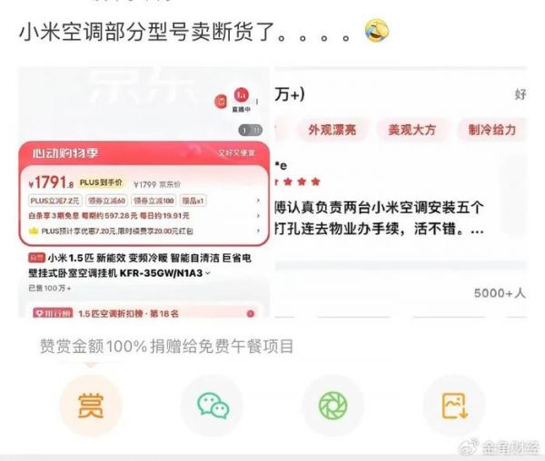 吐槽言论亦印证了此现象,小红书、微博上,有数千条类似“小米空调缺货怎么解决”的内容。有人说,本想趁着有补贴换个小米空调,没想到大家都是这么想的,直接扫断货了;有人喊话雷军,雷总不是想赚钱吗,怎么只生产这点货;干装机外包的师傅也上来说,附近几个乡镇的小米空调装疯了,夏天一个月能装100多台。