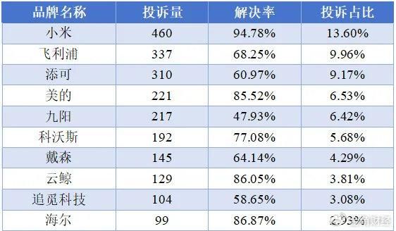 而代工模式所牵扯的生产环节难管理、出问题后难追责等隐患,小米家电也没逃过去。消费保平台数据显示,小家电相关投诉中,小米的投诉量为460件,占比为13.60%,位居第一。