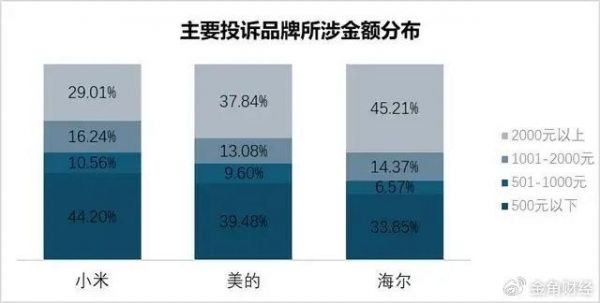 具体到每个品牌,虽然小米关于产品质量问题的投诉占比高达19.98%,但美的、海尔在同样问题上,投诉占比也有17.29%、14.15%。细看各品牌被投诉的产品金额分布,小米2000元以上的产品投诉量为29.01%,美的、海尔2000元以上的产品投诉量分别为37.84%、45.21%。这不禁令人发出灵魂拷问:“原来一分钱一分货,两分钱也还是一分货呀?!”