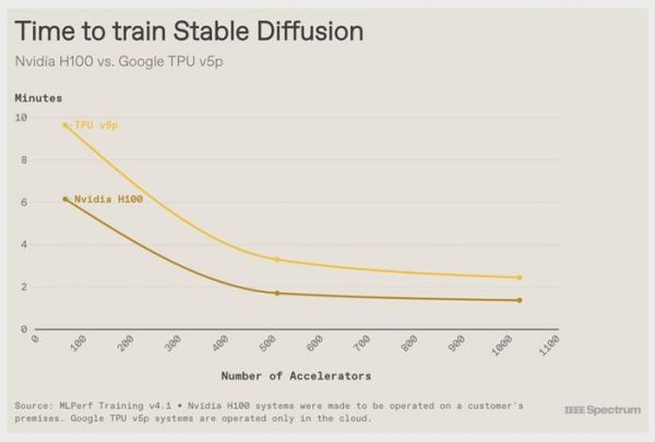 但与所有人的劲敌 Nvidia 相比,情况并不那么乐观。由 6,144 个 TPU v5ps 组成的系统在 11.77 分钟内到达了 GPT-3 训练检查点,远远落后于由 11,616 个 Nvidia H100 组成的系统,后者在大约 3.44 分钟内完成了任务。顶级 TPU 系统仅比其一半大小的 H100 计算机快约 25 秒。