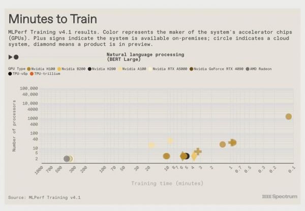 Nvidia、甲骨文、谷歌、戴尔和其他 13 家公司报告了他们的计算机训练当今使用的关键神经网络所需的时间。这些结果包括首次亮相的Nvidia 下一代 GPU B200和谷歌即将推出的加速器Trillium。B200在某些测试中的表现比当今的主力Nvidia芯片H100提高了一倍。而且Trillium 的性能比谷歌在 2023 年测试的芯片提高了近四倍。