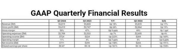 当地时间10月29日,AMD发布2024财年第三季度财报。第三季度,AMD营收68亿美元,同比增长18%,环比增长17%;净利润(GAAP)7.71亿美元,同比增长158%,环比增长191%;毛利率(Gross margin)50%,同比增长3个百分点;摊薄后每股收益(Diluted earnings per shate)0.47美元,同比增长了161%。