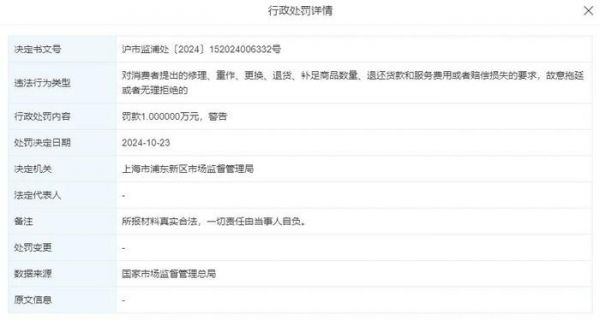天眼查深度风险信息显示,近日,沃尔玛华东百货有限公司因擅自扩大不适用七日无理由退货的商品范围,被上海市浦东新区市场监督管理局罚款1万元。