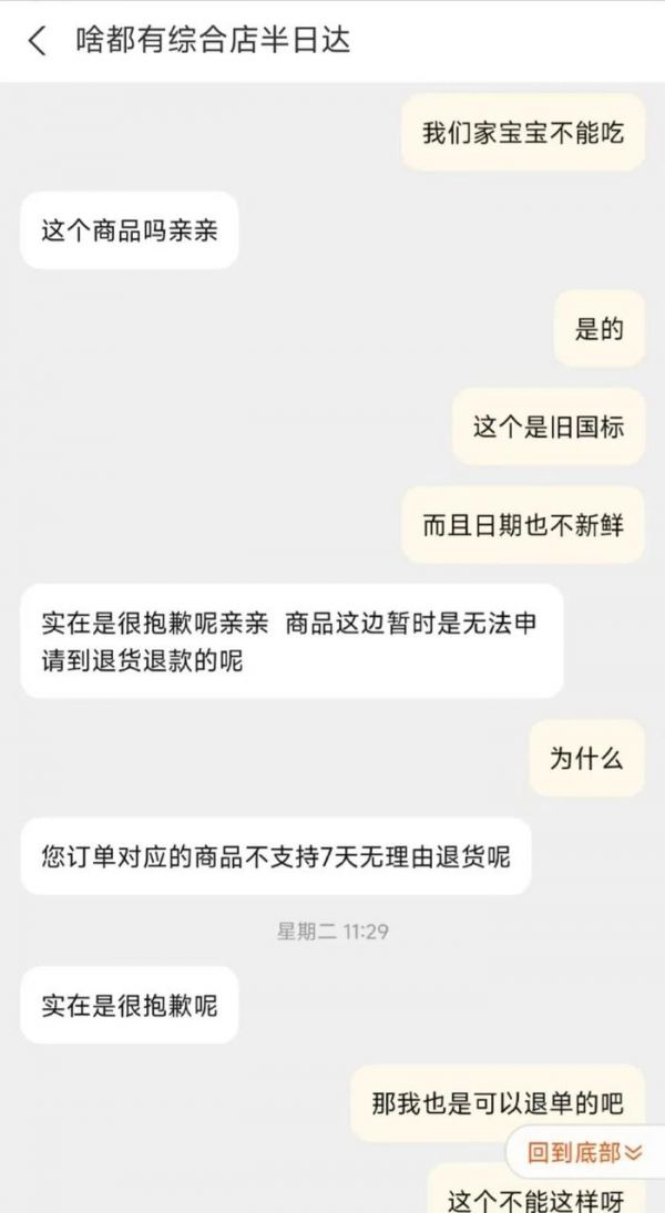 去年3月,苏州消费者邱先生反映,自己购买的一款奶粉,竟是按旧国标配方注册的产品,与他们长期食用的奶粉有较大差异。当天他在未开封的情况下发起退货退款申请,但客服以“该产品不支持七天无理由退货”为由,予以拒绝。