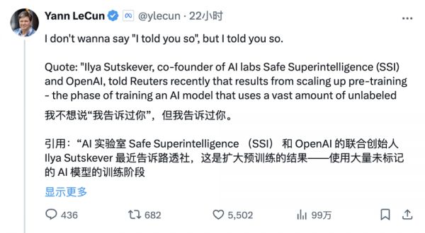 图灵奖得主、Meta AI首席科学家Yann Lecun,昨天兴奋地在X平台转载了路透社采访Ilya Sutskever的采访,并附文称:
