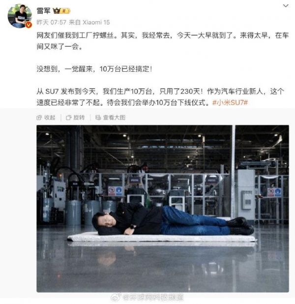 小米SU7已生产10万台,雷军晒照:雷军在车间打地铺