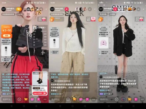 如今,SMFK在抖音电商开设了品牌旗舰店、女装、鞋履三个直播账号,15位主播轮班,基本上实现了全天候直播。其直播间如同一个微型秀场,主播的体重、身高等数据都会明示,让观众作为参考。主播们在镜头前边走动边讲解,近景展示面料和做工细节,远景则展示全身穿搭——在SMFK的直播间,一款单品通常会展示几种甚至十几种搭配方案,可以有效拉升客单均价、提升转化效率。