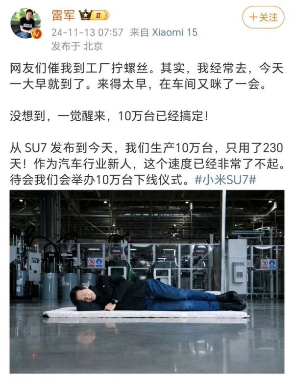 太会整活儿了!雷军一大早去车间拧螺丝:眯了一觉,SU7第10万台搞定了