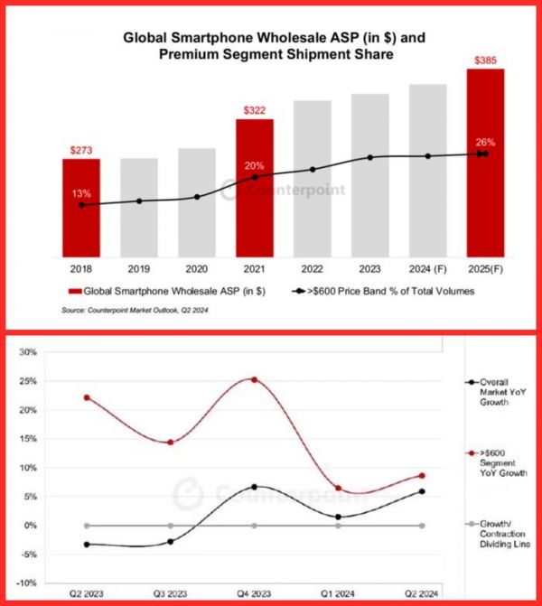 但是根据Counterpoint Research的最新市场预测报告,2024年全球智能手机的平均销售价格预计将同比增长3%,达到365美元(约合2641元人民币)。