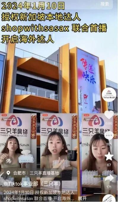 今年1月10日,三只羊网络与新加坡本地达人@shopwithsasax进行首场合作直播,创下了TikTok电商板块在新加坡地区的新纪录,一举登上新加坡本地榜第一。当时合作的新加坡达人“shopwithsasax”,在TikTok上有2.07万粉丝,最早在2023年10月就开始在直播间推荐小杨哥直播间产品,带上#小杨哥#和#小杨臻选#的话题进行宣传。