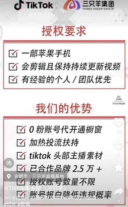 与此同时,三只羊网络出海的抖音账号“TikTok事业部(三只羊)”也在近日接连发布多条招募信息,招募短视频带货剪辑师,向这些剪辑师免费开放TikTok直播回放的授权,即切片带货,并且予以橱窗扶持和投流扶持。
