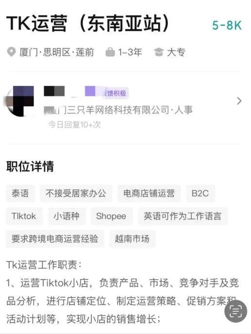 近日,在第三方招聘软件上,小杨哥背后的三只羊厦门分公司正在招募TikTok东南亚小店运营。招聘信息显示,月薪5000-8000元。字母榜尝试和负责招聘的相关人员沟通,对方表示,这份工作是面向东南亚市场,但是在国内工作,主要负责运营TikTok小店,负责与达人进行建联,进行短视频和直播带货,投流以及数据监控等。