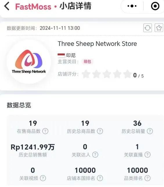 TikTok数据分析平台FastMoss也显示,三只羊小店已经开到了印尼,数据显示,小店在售商品19件,历史总销售额为1241.99万印度尼西亚盾,约合人民币为5700元。
