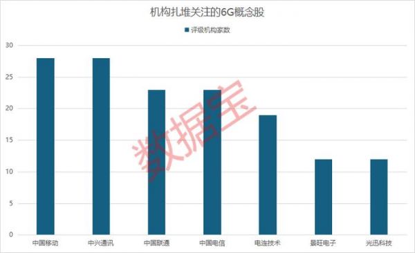 统计显示,A股中涉及6G相关产业链的上市公司共有23家,17家获得机构评级,其中7家评级家数在10家及以上,占比超过总数的三成。中兴通讯、中国移动最受机构关注,评级家数均为28家,其他还有中国联通、中国电信、电连技术评级机构家数居前。